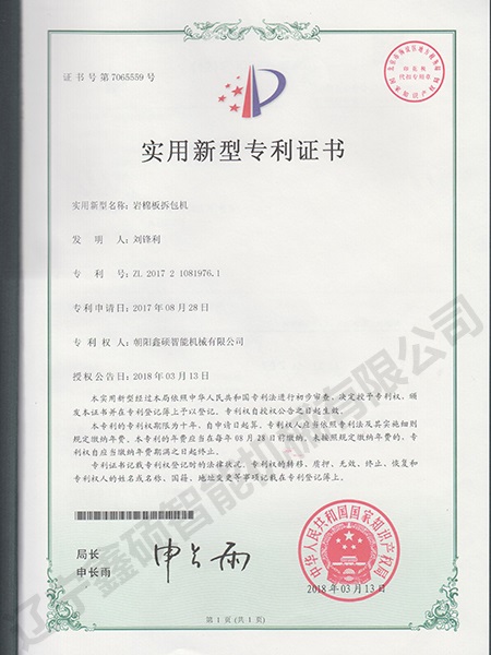Certificate of utility model of rock wool board unpacking machine